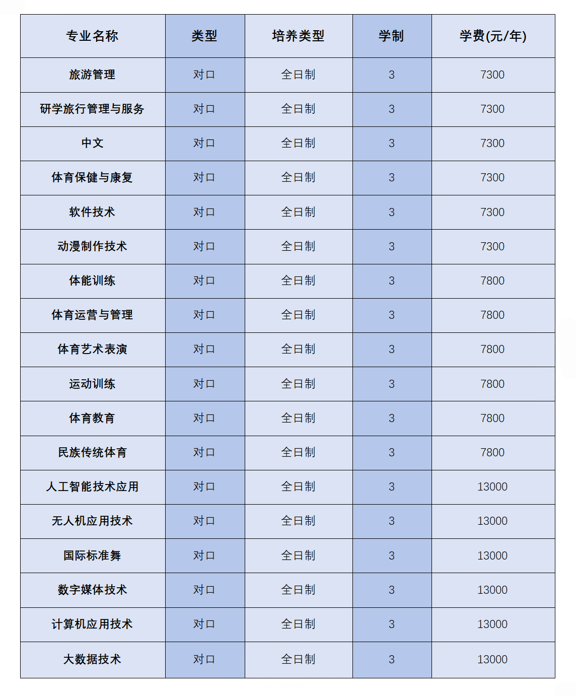 各专业收费标准:旅游管理专业7300元/生·年;研学旅行管理与服务专业7300元/生·年;中文专业7300元/生·年;软件技术专业7300元/生·年;动漫制作技术专业7300元/生·年;体能训练专业7800元/生·年;体育运营与管理专业7800元/生·年;体育艺术表演专业7800元/生·年;运动训练专业7800元/生·年;体育教育专业7800元/生·年;民族传统体育专业7800元/生·年;体育保健与康复专业7300元/生·年;大数据技术专业13000元/生·年;人工智能技术应用专业13000元/生·年;无人机应用技术专业13000元/生·年;数字媒体技术专业13000元/生·年;计算机应用技术专业13000元/生·年;国际标准舞专业13000元/生·年。